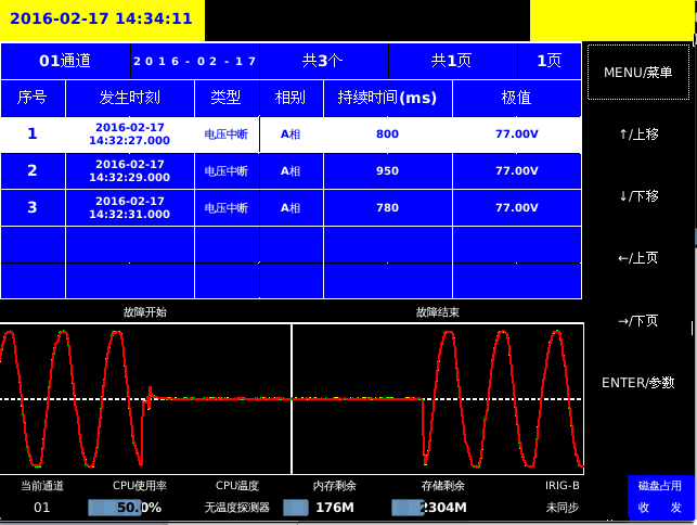 本界面為在主菜單中選中暫態(tài)功能后顯示的暫態(tài)數(shù)據(jù)監(jiān)測界面,提供電壓驟升,暫降,中斷等暫態(tài)事件的監(jiān)測信息。當前界面顯示某通道一天內(nèi)記錄的所有暫態(tài)事件,按發(fā)生時刻降序排列提供瀏覽查詢。故障開始、結(jié)束波形為選中序號(光標高亮)對應(yīng)的故障錄波波形。