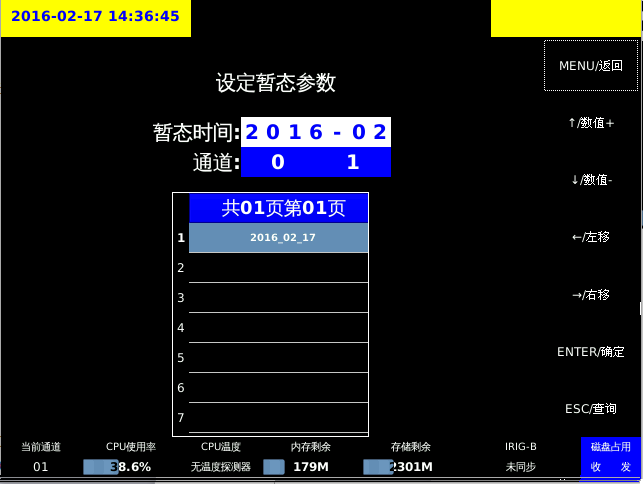 在此界面中,可以按↑↓鍵更改當前頁中查看暫態(tài)事件序號;當暫態(tài)數(shù)量多于5個,在當前頁顯示不下時,按←→鍵可更改當前顯示頁;按ENTER(確認鍵)可更改查看暫態(tài)的參數(shù)(時間和通道);按MENU鍵返回主菜單。