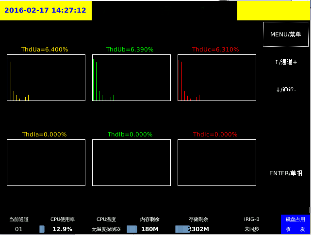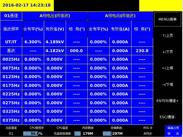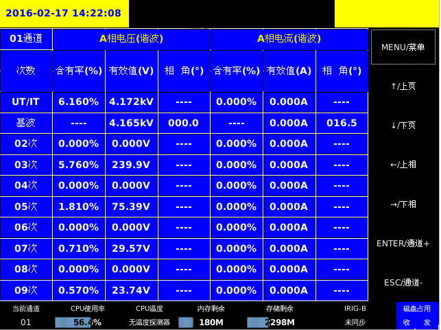在此界面中,可以按↑↓鍵更改間諧波次數(shù);←→鍵在A、B、C三相間切換;按ENTER(確認鍵)查看下一個通道;按ESC鍵查看上一個通道;按MENU鍵返回主菜單。