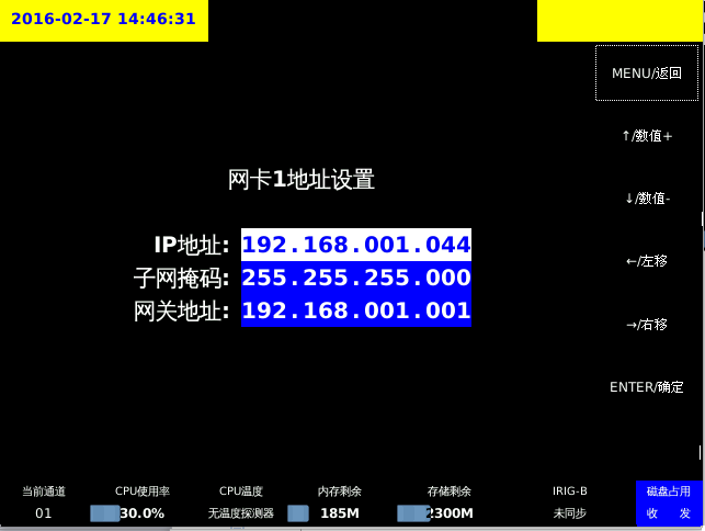 在此界面中,可以按↑↓鍵可更改當前選定項數(shù)值;←→鍵更改當前選定項(高亮閃動);按ENTER(確認鍵)確認修改網(wǎng)絡(luò)參數(shù);未確認修改前按MENU鍵會放棄改任何當前修改,并返回儀器設(shè)置界面。