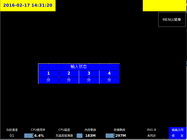 本界面為在主菜單中選中開入狀態(tài)功能后顯示的開入量監(jiān)測界面,提供設(shè)備所檢測的4個輸入狀態(tài)的分合狀態(tài)監(jiān)測信息。