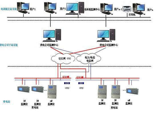 整個網(wǎng)絡(luò)分為采集單元、變電站監(jiān)測層和上級監(jiān)測層三個部分。采集單元為監(jiān)測終端,通過以太網(wǎng)將數(shù)據(jù)傳送至當?shù)乇O(jiān)控系統(tǒng)。用戶可通過上級監(jiān)測層和當?shù)乇O(jiān)控系統(tǒng)進行管理。