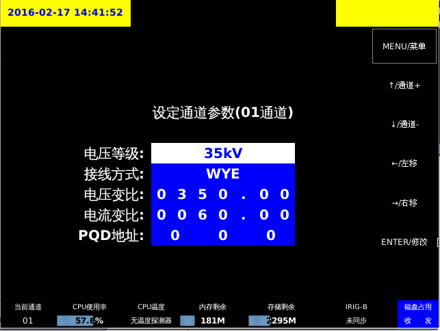 本界面為在主菜單中選中通道設(shè)置功能并通過口令驗證后顯示的通道參數(shù)修改界面,提供電壓等級、接線方式,電壓變比,變流變比,PQD地址的參數(shù)設(shè)置。