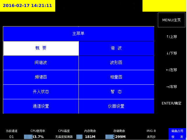 本界面提供設(shè)備主功能菜單選擇,標準配置功能為數(shù)據(jù)概要,諧波,波形圖,頻譜圖,相量圖,開入狀態(tài),通道設(shè)置和儀器設(shè)置。間諧波與暫態(tài)為高級選配功能,高級用戶可以使用。