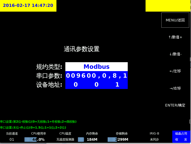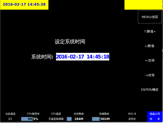 本設(shè)備B碼對時為選配功能。當使用B碼對時界面底部“IRIG-B未同步”字樣消失,并顯示衛(wèi)星鐘傳輸?shù)腎RIG-B所表示的時間。