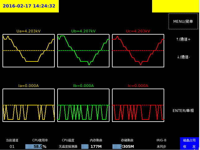 在此界面中,可以按↑↓鍵更改查看通道;按ENTER(確認鍵)單獨放大某一相的波形;按MENU鍵返回主菜單。