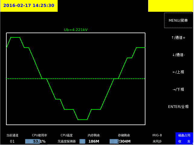 在此界面中,可以按↑↓鍵更改查看通道;←→鍵在A、B、C三相電壓,電流間切換;按ENTER(確認鍵)返回波形監(jiān)測界面;按MENU鍵返回主菜單。