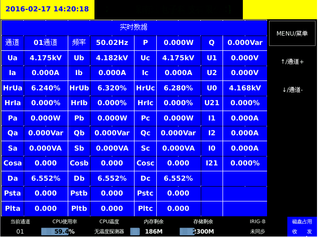 此界面為設(shè)備啟動以后的默認界面,提供電能質(zhì)量數(shù)據(jù)概要。主要包括:頻率,有效值(Ua,Ub,Uc,Ia,Ib,Ic)、畸變率(HrUa,HrUb,HrUc,HrIa,HrIb,HrIc)、有功(P)無功(Q)、分項有功(Pa,Pb,Pc)分項無功(Qa,Qb,Qc)、視在功率(Sa,Sb,Sc)、功率因數(shù)(Cosa,Cosb,Cosc)、波動(Da,Db,Dc)、短閃變(Psta,Pstb,Pstc)、長閃變(Plta,Pltb,Pltc)、電壓電流正序(U1,I1)、電壓電流負序(U2,I2)、電壓電流零序(U0,I0)、電壓電流不平衡度(U21,I21)。