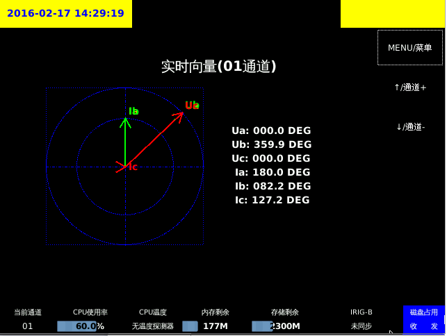 本界面為在主菜單中選中相量圖功能后顯示的電壓、電流圖形向量監(jiān)測界面,提供三相電壓、電流的向量圖形監(jiān)測信息,以及各相相角數(shù)據(jù)。