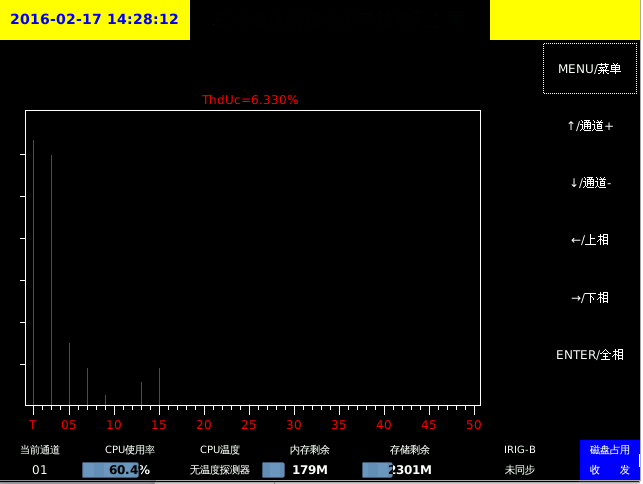 本界面為在主菜單中選中諧波功能后顯示的諧波監(jiān)測界面,提供總諧波畸變率(UT/IT),基波,各次(2~63次)諧波畸變率、有效值,基波相角數(shù)據(jù)的監(jiān)測信息。
