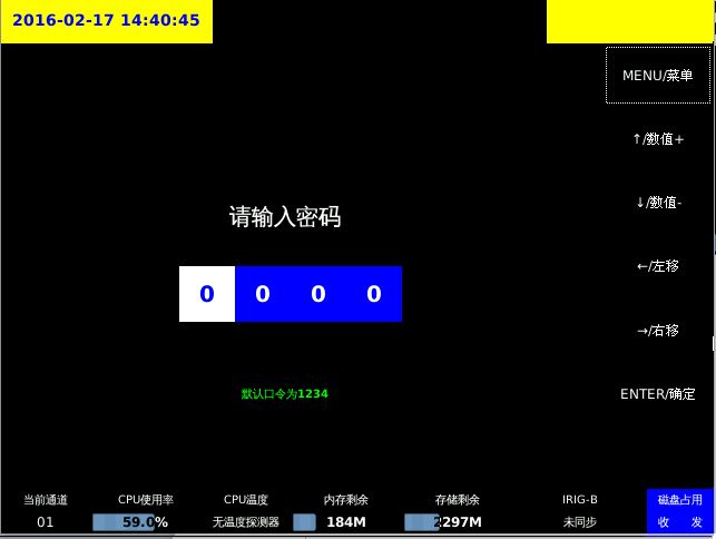 本界面為在主菜單中選中通道設(shè)置、儀器設(shè)置功能后顯示的口令確認界面,是設(shè)置通道參數(shù),儀器參數(shù)前防止誤觸的口令輸入確認界面。默認口令為1234。