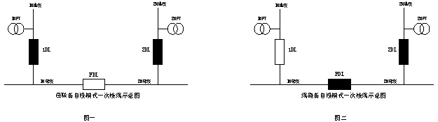 此裝置適用于如下圖所示母聯(lián)分段供電方式,備自投方式分為母聯(lián)備自投方式(也稱為橋模式)和進(jìn)線備自投方式。母聯(lián)備自投方式(圖一)為兩條進(jìn)線分別帶一條母線,在一條進(jìn)線失電的情況下跳開失電進(jìn)線,然后合分段開關(guān)使系統(tǒng)運(yùn)行在一條進(jìn)線帶兩條母線的狀態(tài)。進(jìn)線備自投方式(圖二)為主進(jìn)線帶兩條母線,另一進(jìn)線作為備用電源,在主進(jìn)線失電的情況下跳開主進(jìn)線合備用進(jìn)線,使系統(tǒng)運(yùn)行在備用進(jìn)線帶兩條母線的狀態(tài)。