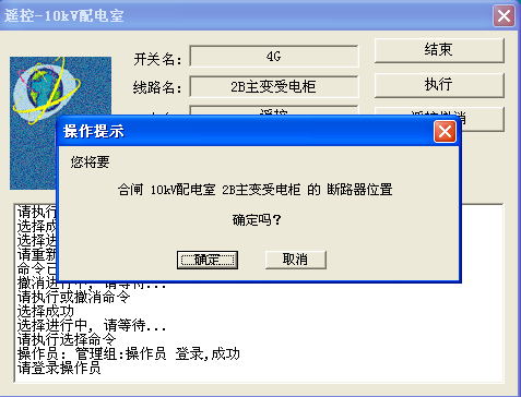 2、選擇:點(diǎn)擊‘選擇’圖標(biāo)。‘選擇’操作成功后,對話框上會(huì)出現(xiàn)增加‘執(zhí)行’、‘遙控撤消’按鈕,用戶要執(zhí)行什么操作,點(diǎn)擊相應(yīng)的按鈕即可。如點(diǎn)擊‘執(zhí)行’會(huì)彈出確定框,點(diǎn)擊‘確定’下發(fā)遙控命令,斷路器合閘;‘取消’遙控操作將會(huì)取消。