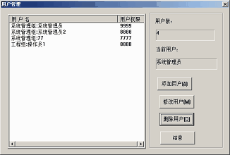 如需添加密碼或者新增用戶名,可選擇如下步驟:點(diǎn)擊‘用戶登錄’圖標(biāo),選擇用戶名,輸入相應(yīng)的密碼,即可進(jìn)行相關(guān)的操作;用戶登錄后該圖標(biāo)變?yōu)椤脩敉顺觥c(diǎn)擊可退出當(dāng)前用戶。點(diǎn)擊‘用戶管理’圖標(biāo),彈出用戶管理界面如下圖,可添加用戶、修改用戶和刪除用戶。