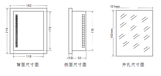 本產(chǎn)品為面板式安裝,其標準配件有:溫濕度傳感器、溫濕度傳感器線、安裝支架、?綠接線端子等。安裝時只需在開關(guān)柜面板上開好孔,開關(guān)柜開孔尺寸為121mm×182mm, 將裝置嵌入開孔,只需用三個安裝支架卡入裝置固定孔后旋緊,緊箍螺釘即可。