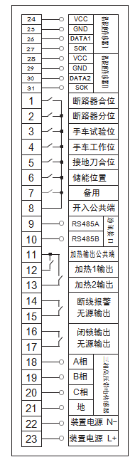 (1)?裝置電源端子為22、23,電壓為AC/DC220V或110V±10%;裝置加熱器輸出為無源繼電器觸點輸出,加熱電源外部接線。
