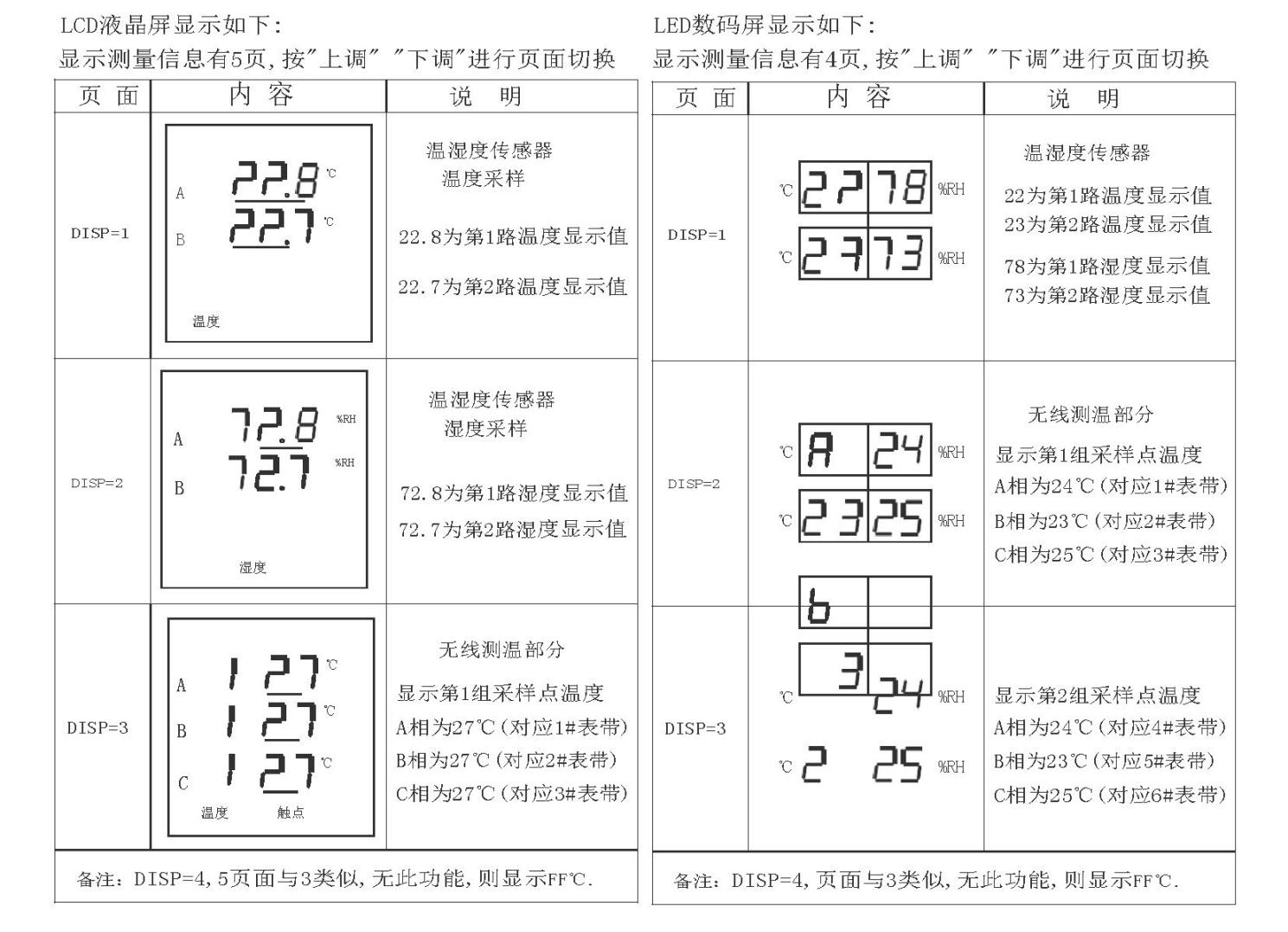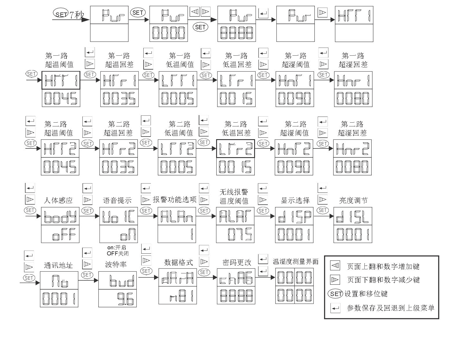 在顯示狀態(tài)下,“上調(diào)”鍵為頁面上翻鍵,“下調(diào)”為頁面下翻鍵,“確認照明”鍵為照明功能開關(guān)鍵,按一下,則照明指示燈亮,照明輸出繼電器動作,再按一下,則照明關(guān)閉。(照明持續(xù)時間為24小時,過后,則需重新再按一下開關(guān))