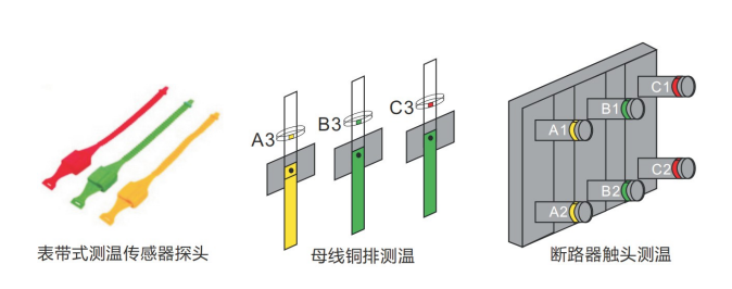 1)?3點測溫:將第一對觸點編號一致的表帶(A1/?B1/?C1)綁在斷路器上觸頭, 表帶測溫接觸面緊貼觸頭上;
