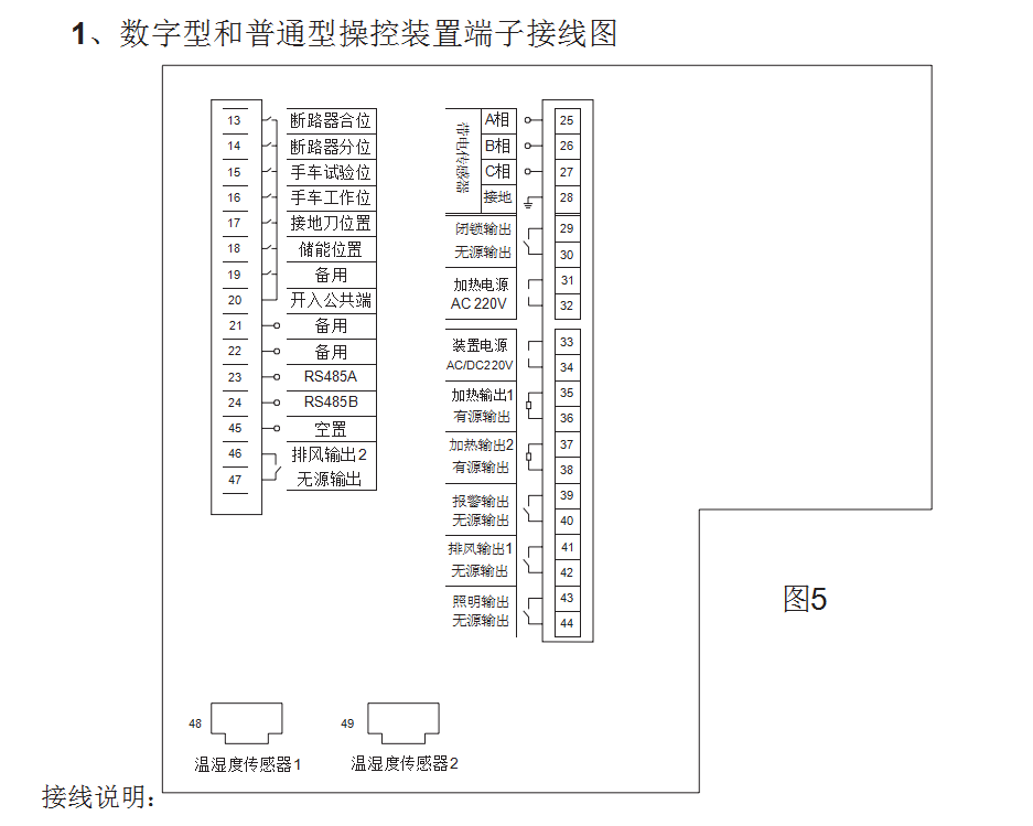 (3)?附件溫濕度傳感器線的接線方法是:將USB插件接頭端接在裝置的溫濕度傳感器端子(48、49),另一端接在配套的溫濕度傳感器上。