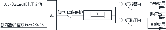 若裝置線電壓曾大于失電定值1.05倍,現(xiàn)在小于失壓定值且保護(hù)電流回路無(wú)流,開(kāi)關(guān)在合位,則系統(tǒng)失壓動(dòng)作,輸出跳閘出口。系統(tǒng)失壓保護(hù)邏輯如下圖所示: