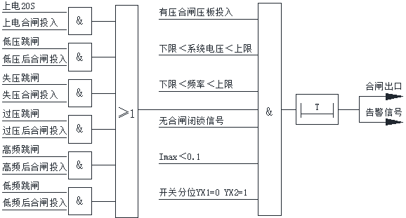 裝置動(dòng)作后,上級(jí)開(kāi)關(guān)送電,經(jīng)延時(shí)后,有壓合閘動(dòng)作。有壓合閘保護(hù)邏輯如下圖所示: