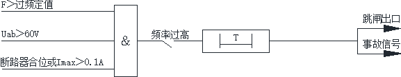 裝置支持頻率過(guò)高保護(hù),頻率過(guò)高保護(hù)的功能投退、定值和延時(shí)都可獨(dú)立整定,頻率過(guò)高保護(hù)動(dòng)作都會(huì)點(diǎn)亮故障指示燈。邏輯如下圖所示: