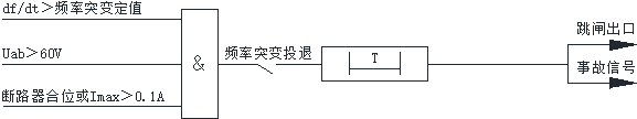 裝置支持頻率突變保護(hù),頻率突變保護(hù)的功能投退、定值和延時(shí)都可獨(dú)立整定,頻率突變保護(hù)動(dòng)作都會(huì)點(diǎn)亮故障指示燈。邏輯如下圖所示: