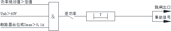 裝置支持逆功率保護(hù),逆功率保護(hù)的功能投退、定值和延時(shí)都可獨(dú)立整定,逆功率保護(hù)動(dòng)作都會(huì)點(diǎn)亮故障指示燈。邏輯如下圖所示: