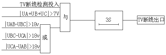 且任意兩個(gè)線電壓模值之差大于18V,滿足以上條件后經(jīng)延時(shí)3S后報(bào)PT斷線,原理框圖如下圖所示: