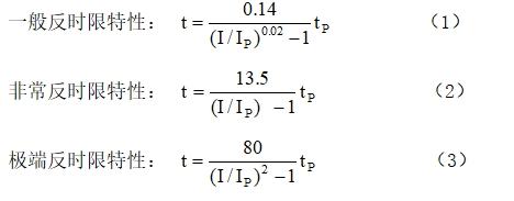 可選擇使用下面三個(gè)標(biāo)準(zhǔn)的反時(shí)限特性之一。反時(shí)限特性電流基準(zhǔn)值IP為相間Ⅲ段電流定值,反時(shí)限特性時(shí)間常數(shù)tP為相間Ⅲ段延時(shí)定值。