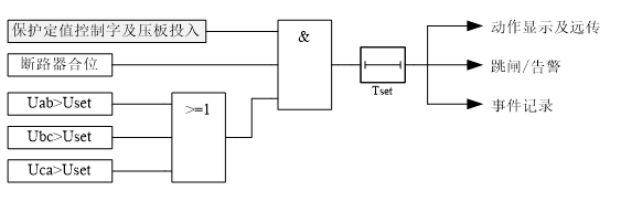 保護(hù)軟壓板及控制投入,當(dāng)任一相線電壓大于設(shè)定值時(shí),經(jīng)延時(shí)跳閘或告警。