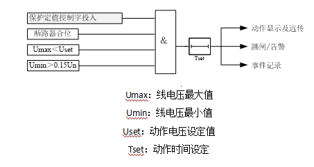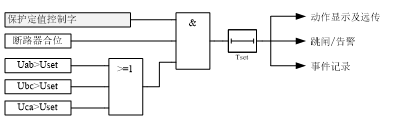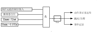 以上三個(gè)方程式中,I為保護(hù)采集電流;t為動(dòng)作時(shí)間;Ip為電流基準(zhǔn)值,取反時(shí)限過流保護(hù)基準(zhǔn)值;Tp為時(shí)間常數(shù),取反時(shí)限過流保護(hù)時(shí)間常數(shù)。反時(shí)限過流保護(hù)原理如圖所示。 圖3.3?反時(shí)限過流保護(hù)原理框圖 ? 對(duì)線路保護(hù)裝置設(shè)置了獨(dú)立的過流加速保護(hù), 可通過定值選擇功能投入。后加速方式是線路上均裝有選擇性的保護(hù)和重合閘,線路故障時(shí)保護(hù)按有選擇性的方式動(dòng)作跳閘,再重合,當(dāng)重合于故障或者手合于永久性故障時(shí),后加速保護(hù)無選擇性的動(dòng)作跳閘,加速故障的切除。 圖 3.4 過流加速保護(hù)原理框圖 ? 裝置設(shè)有過負(fù)荷保護(hù),由壓板進(jìn)行投退。過負(fù)荷保護(hù)由控制字選擇跳閘或告警。對(duì)于電動(dòng)機(jī)保護(hù)裝置,在電動(dòng)機(jī)啟動(dòng)過程中,過負(fù)荷保護(hù)自動(dòng)退出。過負(fù)荷保護(hù)原理框圖如圖所示。 圖 3.5?過負(fù)荷保護(hù)原理框圖 ? 在小電流接地系統(tǒng),當(dāng)系統(tǒng)中發(fā)生接地故障時(shí),其接地故障點(diǎn)的零序電流基本為電容電流,且幅值很小,用零序過流繼電器來保護(hù)接地故障很難保證其選擇性。在本裝置中接地保護(hù)實(shí)現(xiàn)時(shí),由于各裝置通過網(wǎng)絡(luò)互聯(lián),信息可以共享,故采用上位機(jī)比較同一母線上各線路零序電流基波的方法來判斷接地線路。用于接地選線的零序電流必須外加,即必須給裝置提供外部輸入的零序電流,不能使用裝置自產(chǎn)的零序電流。 在經(jīng)小電阻接地系統(tǒng)中,接地零序電流相對(duì)較大,可以采用直接跳閘方法。用于跳閘或報(bào)警的零序電流須從裝置的零序TA 引入。 裝置中設(shè)三段零序過流保護(hù),可由軟壓板進(jìn)行投退。三段零序過流保護(hù)可通過控制字選擇告警或跳閘(整定為“0”表示告警,整定為“1”表示跳閘)。零序過流保護(hù)原理框圖如圖所示。 圖 3.6 零序過流保護(hù)原理框圖 裝置中設(shè)低壓側(cè)零序過流保護(hù),可由軟壓板進(jìn)行投退。低壓側(cè)零序過流保護(hù)作為低壓側(cè)接地保護(hù),可通過控制字選擇告警或跳閘(整定為“0”表示告警,整定為“1”表示跳閘)。低壓側(cè)零序過流保護(hù)原理框圖如圖所示。 圖3.7?低壓側(cè)零序過流保護(hù)原理框圖 ? 裝置設(shè)置兩段定時(shí)限負(fù)序過流保護(hù),可由軟壓板進(jìn)行投退。負(fù)序過流保護(hù)分別對(duì)反相、斷相、匝間短路以及較嚴(yán)重的電壓不對(duì)稱等異常運(yùn)行狀況提供保護(hù)。其中,負(fù)序Ⅰ段作為不平衡保護(hù)的主保護(hù),只動(dòng)作于跳閘;負(fù)序Ⅱ段為不平衡保護(hù)的后備保護(hù),可由控制字選擇跳閘或告警(整定為“0”表示告警,整定為“1”表示跳閘)。負(fù)序定時(shí)限過流保護(hù)原理框圖如圖所示。 ? 圖3.8?負(fù)序過流保護(hù)原理框圖 ? 裝置設(shè)有低頻減載功能,可由軟壓板進(jìn)行投退。低頻減載設(shè)有電壓閉鎖、滑差閉鎖。當(dāng)系統(tǒng)發(fā)生故障,頻率下降過快超過滑差閉鎖定值時(shí)瞬時(shí)閉鎖低頻減載保護(hù)。線路保護(hù)中低頻減載保護(hù)動(dòng)作。低頻減載保護(hù)原理如圖所示。 ? 圖 3.9 低頻減載原理框圖 裝置設(shè)有過電壓保護(hù),可由軟壓板進(jìn)行投退。位于合位或有流時(shí)才投入過電壓保護(hù),對(duì)于電容器保護(hù)來說,過電壓保護(hù)可通過控制字選擇告警或跳閘(整定為“0”表示告警,整定為“1”表示跳閘)。電動(dòng)機(jī)保護(hù)中只有跳閘功能。過電壓保護(hù)原理如圖所示。 Uset:動(dòng)作電壓設(shè)定值 Tset:動(dòng)作時(shí)間設(shè)定值 圖 3.10??過電壓保護(hù)原理框圖 裝置設(shè)有低電壓保護(hù),可由軟壓板進(jìn)行投退。 Umax:線電壓最大值 Umin:線電壓最小值 Uset:動(dòng)作電壓設(shè)定值 Tset:動(dòng)作時(shí)間設(shè)定 ? 圖3.11低電壓保護(hù)原理框圖 裝置設(shè)有失壓保護(hù),可由軟壓板進(jìn)行投退。 圖3.12失壓保護(hù)原理框圖 裝置設(shè)有零序過電壓保護(hù),可由軟壓板進(jìn)行投退。零序電壓默認(rèn)為自產(chǎn)零序電壓。也可通過硬件采集零序電壓實(shí)現(xiàn)。 在不接地或小電流接地系統(tǒng)中,當(dāng)發(fā)生接地故障時(shí),其接地故障點(diǎn)的零序電流基本為容性電流,且幅值很小,用零序過流繼電器來檢測(cè)接地故障很難保證其選擇性,因此可投入零序過壓保護(hù)作為不接地或小電流接地系統(tǒng)中廠變高壓側(cè)接地時(shí)的保護(hù)。 零序過壓保護(hù)可通過控制字選擇告警或跳閘(整定為“0”表示告警,整定為“1”表示跳閘)。零序過電壓保護(hù)原理如圖所示。 備注: (1) 自動(dòng)投切動(dòng)作時(shí)間建議大于2 ?秒; (2) 為防止誤自投于故障電容器,手跳、遙跳、保護(hù)動(dòng)作或有閉鎖投切開入時(shí),本保護(hù)裝置自動(dòng)退出“ 自投切” 裝置設(shè)有不平衡電壓保護(hù),可由軟壓板進(jìn)行投退。不平衡電壓保護(hù)主要反映電容器組內(nèi)部故障。不平衡電壓保護(hù)原理如圖所示。 圖 3.15?不平衡電壓保護(hù)原理框圖 裝置設(shè)有三相一次重合閘功能,可由軟壓板進(jìn)行投退