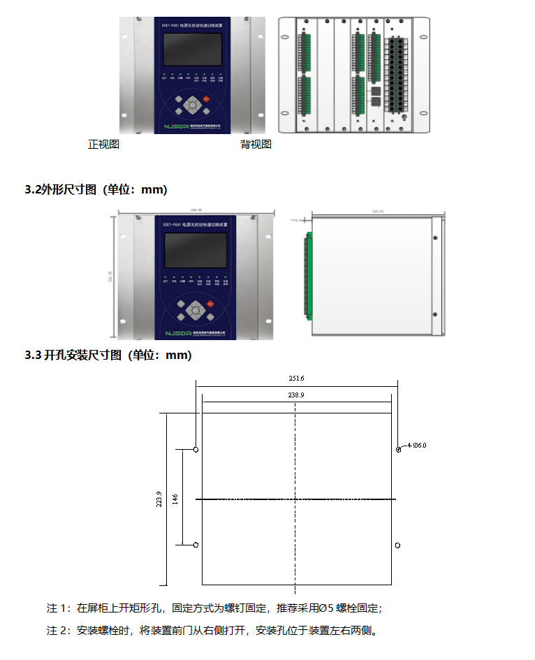 注1:在屏柜上開矩形孔,固定方式為螺釘固定,推薦采用?5螺栓固定;